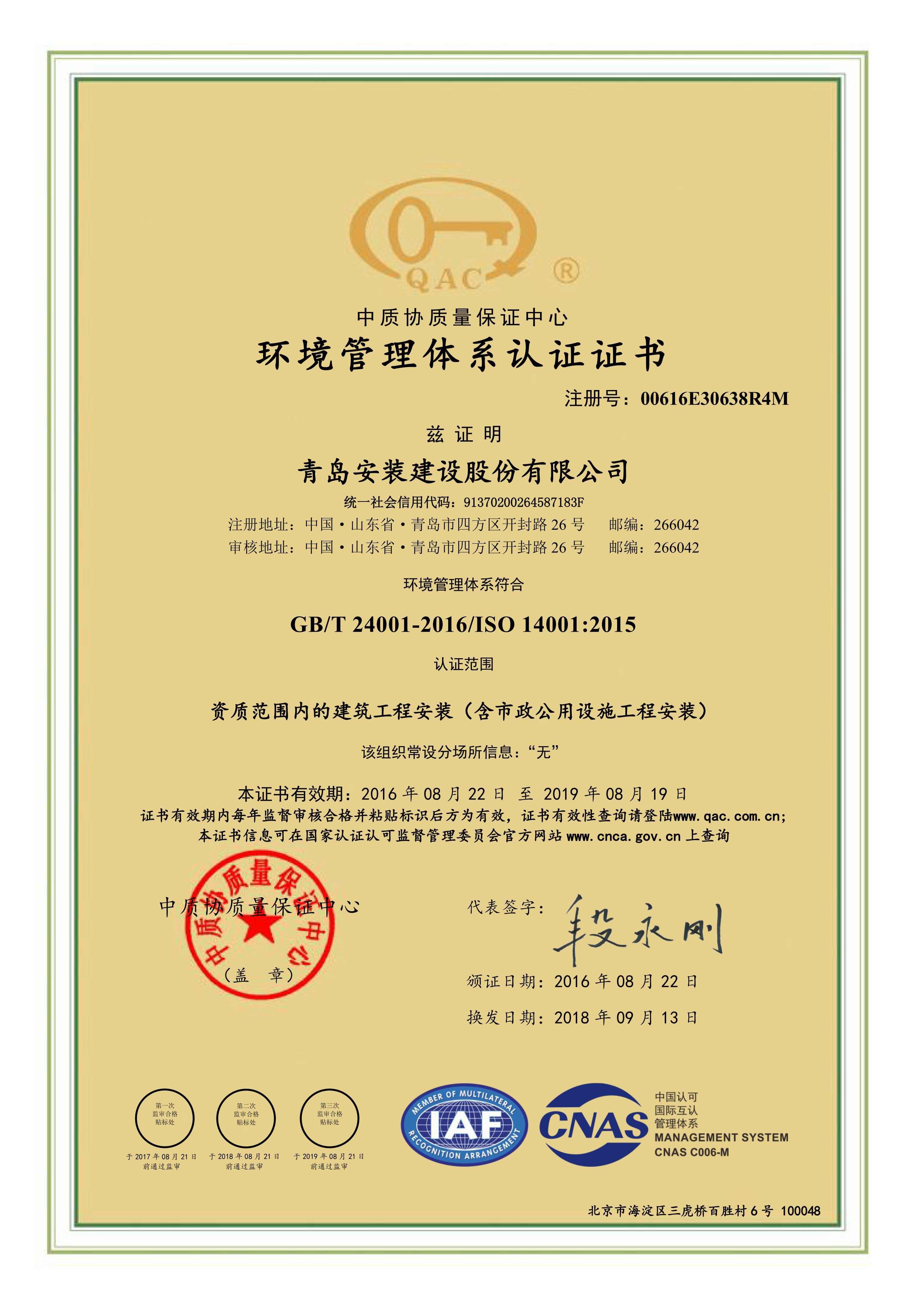 環境管理體系認證證書