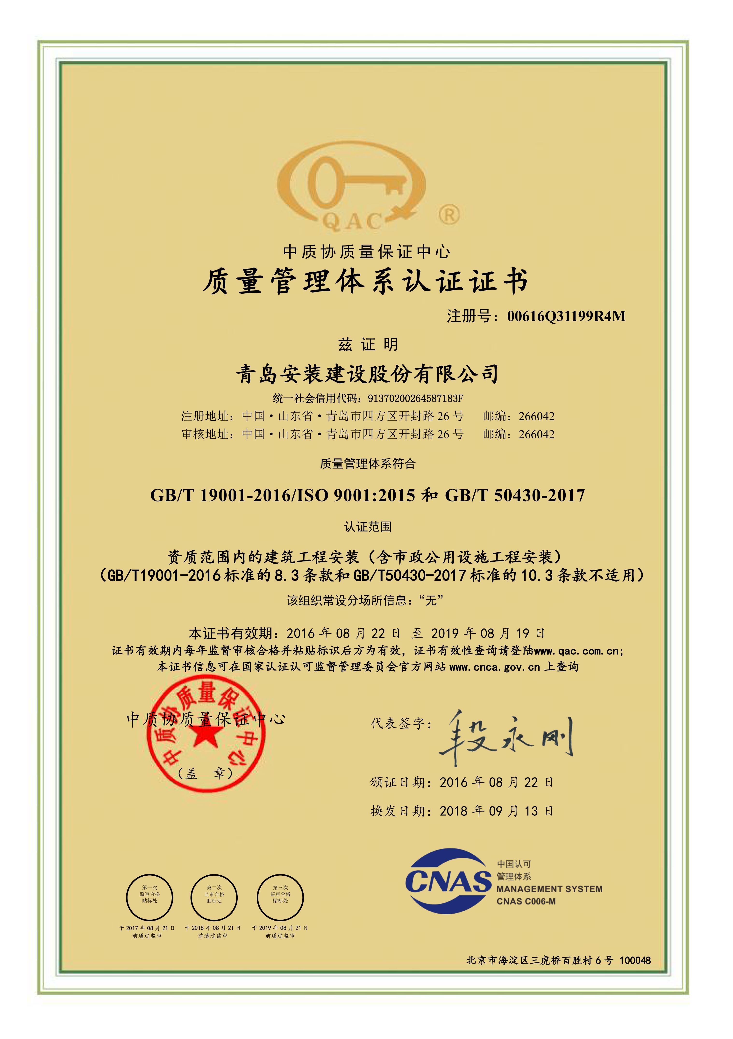 質量管理體系認證證書